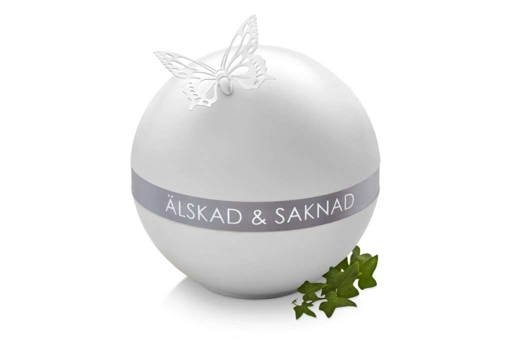En personlig rund urna som är 100 % biologiskt nedbrytbar. Till urnan följer en nätt och vacker avtagbar fjärilssymbol på magnet som kan tas med hem. På det eleganta sidenbandet, som finns att välja i flera färger, skrivs en sista hälsning med text i silver. Väljer du Standardvarianten blir texten ÄLSKAD & SAKNAD enligt bilden.